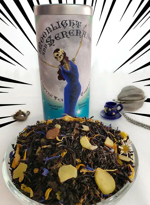 Lush and Romantic! It's like drinking the velvety light of the moon. A distinct blend of creamy English Earl Grey Black Tea with just the right accent of luscious Vanilla and crisp Almonds. A beautiful dreamscape blended to infuse joy, calm, and relaxation in the blessed union of song in a cup! Available: In Special Edition Collector's Gothic Tea Tins. Each Tin comes with 4 ounces of our delicious tea. The label features original gothic art. Luxury Ingredients: Black Tea*, Cornflower Petals, Calendula Petals, Sunflower Petals, Jasmine Flowers, Almond Pieces, & Vanilla Bean. *Organic Certified Organic by Pro-Cert Organic Systems (Organic Equivalency with COR, NOP, EU, JAS) Tea(s) From: India / China Antioxidant Level: Very High Caffeine Level: Medium 2 grams | 8 oz water | 212°F | Steep 2-4 minutes for Taste