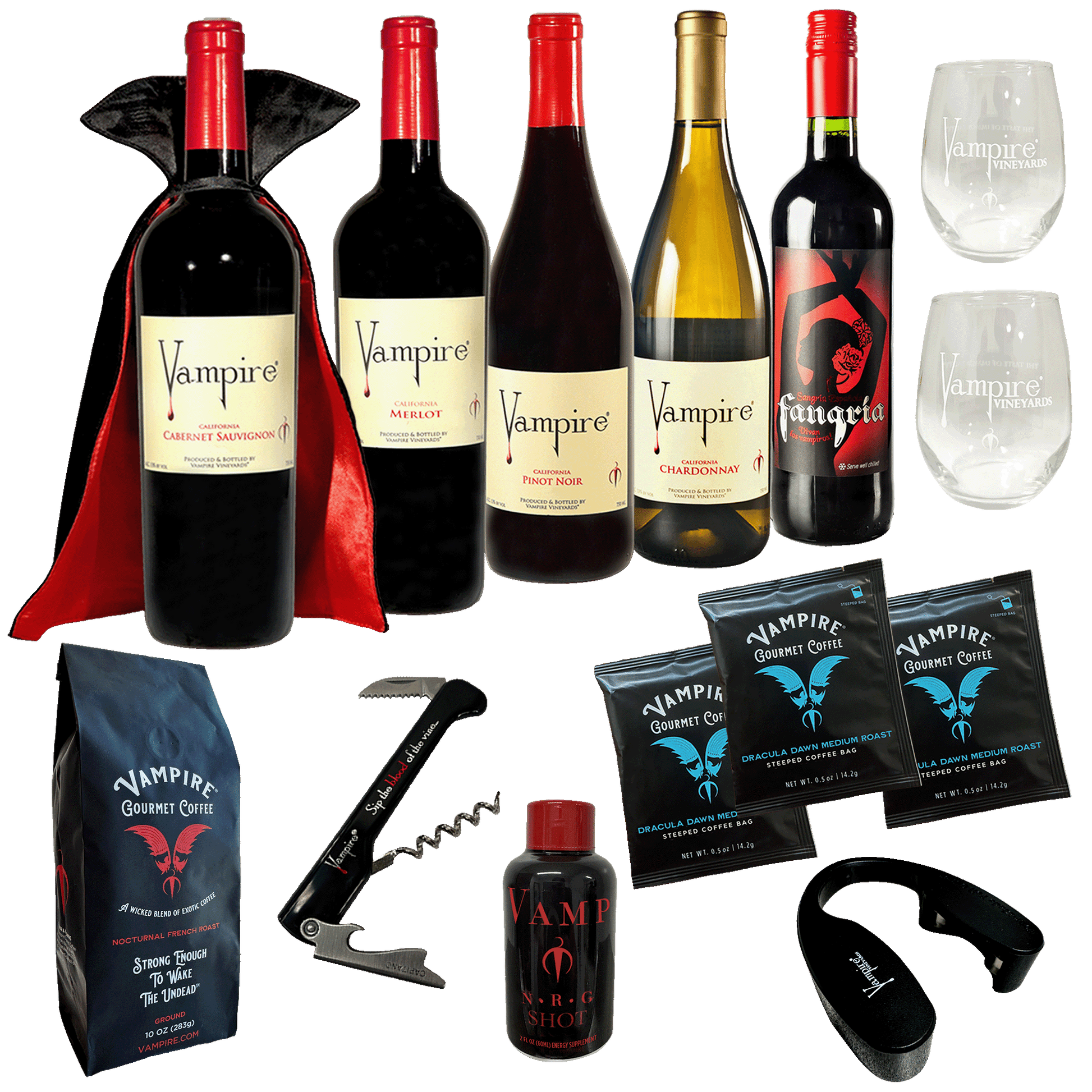The Vampire Starter Kit is meant to transform you. It lets you experience the intricacies of our award winning wines, coffee, chocolate and gummies plus gives you everything you need to sample the taste of immortality®. Receive five of our most popular bottles of wine, plus this kit includes our Vampire waiter's corks crew, two Vampire® stemless wine glasses, three single serving bags of Vampire med roast coffee, a 10 oz. bag of our amazing French roast coffee, our essential wine foil cutter, and one delicious VAMP NRG Energy Shot.